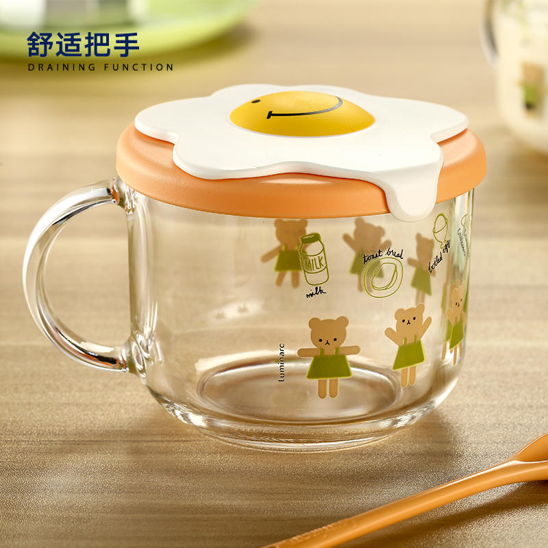 Luminarc/乐美雅玻璃杯早餐杯500ml家用杯子牛奶麦片水杯带盖勺子